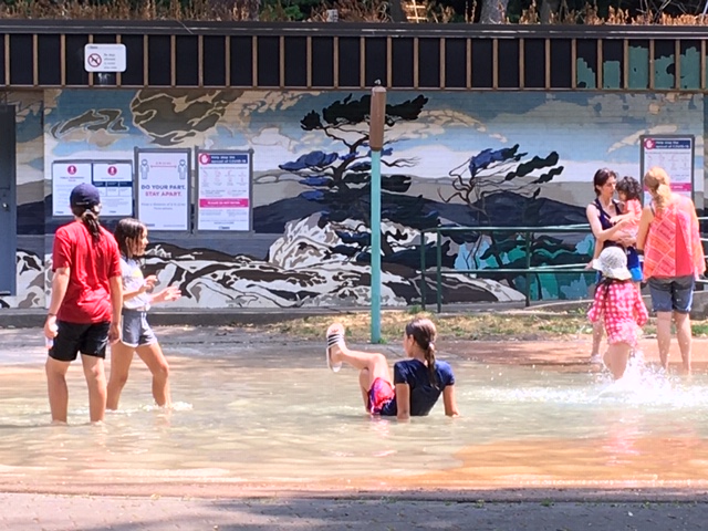 We found an empty picnic table near the splash pad, and set out our lunch. We were not too far away from a group of little campers and a counsellor, taking a break while the park maintenance crew gave the splash pad its hourly cleaning. The kids were getting a little restless and they began climbing onto the picnic tables and giving each other “massages” aka play fighting. The counsellor was clearly losing his patience as he waited for the splash pad to re-open.