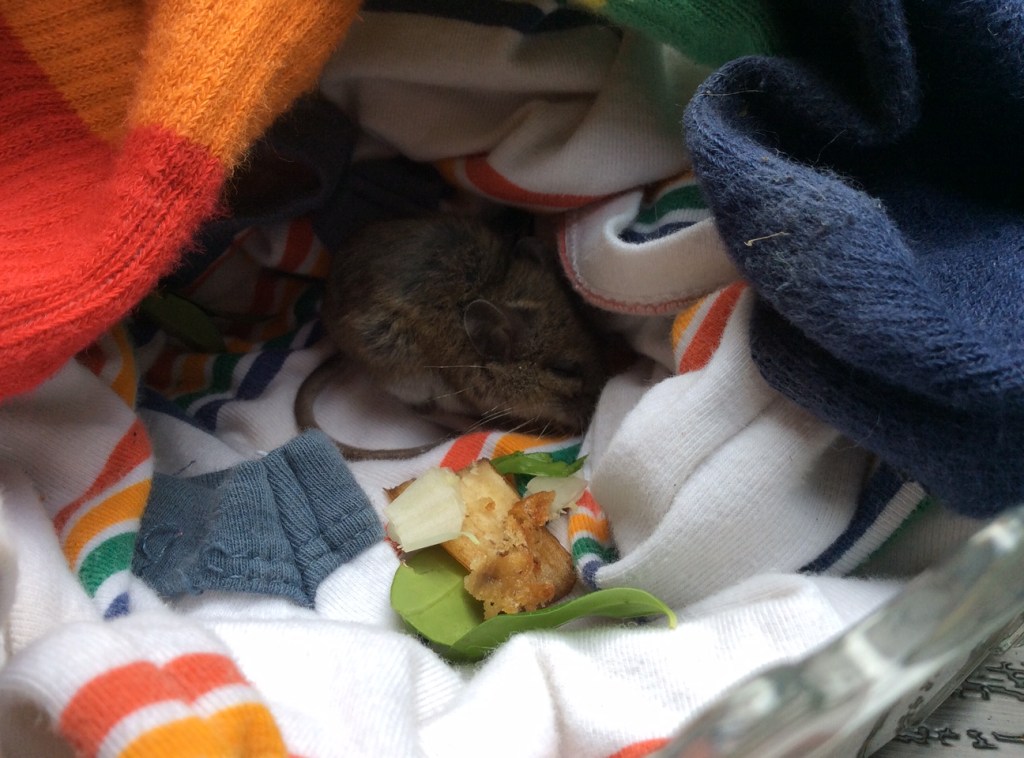 Next they googled what to feed the mouse. They discovered that lettuce is not healthy for mice, but cheese and peanut butter would be perfect. They also fed they little guy some crumbs of banana muffins that we had baked the previous day. Then the mouse was shivering so they needed a blanket for his little bed. Seeing no material handy, Agnes took off her socks and cut them into little blanket squares. Ooops…mothering gone too far!