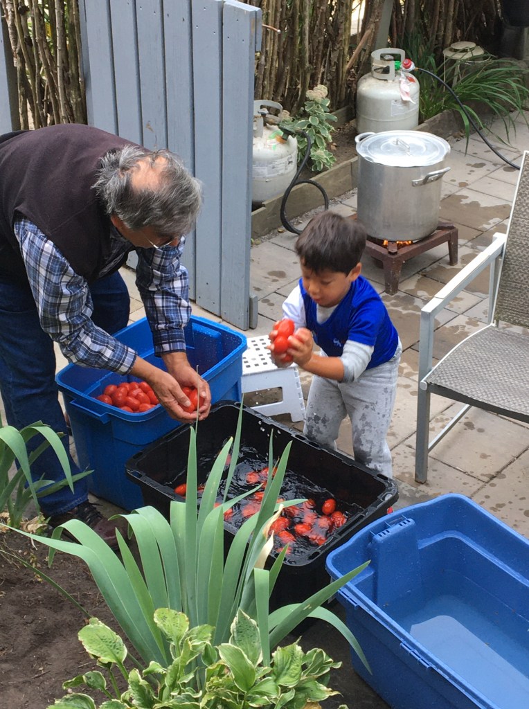 On the morning of Tomato Day Peter and I tried not to look too gleeful as we loaded up the car with supplies. We made an easy trip across the city on a deserted expressway. Apparently all the other Tomato Day workers were still sleeping. When we arrived at Daniel’s place, he was already setting up tables, and our grandson Ben, was dying to get started. Actually what he really wanted was to eat pasta, his favourite meal, and he knew we had to make the tomato sauce first. “Hurry up, Nonno!” he cried.