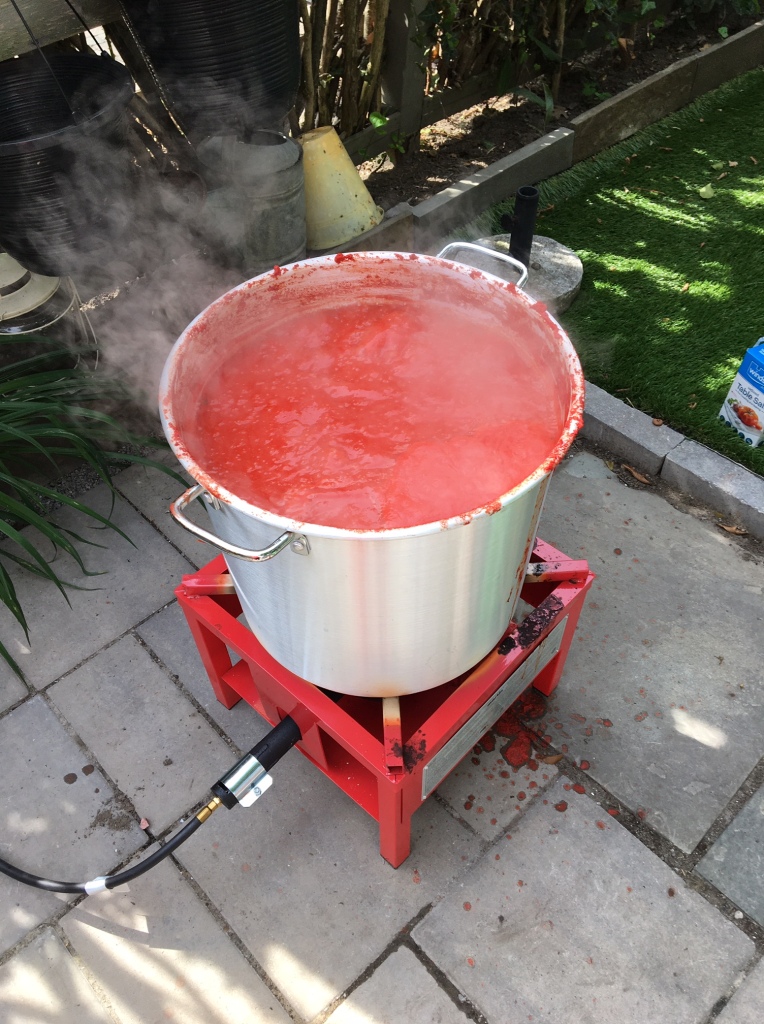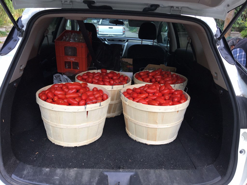 When we decided to move to the city we knew that a small house in a subdivision would not be a suitable tomato house. And, to be honest, we aren’t getting any younger and Tomato Day is a Lot of work! We canvassed our kids, all the ones who eat these jarred tomatoes, to see if anybody would like to take over the role of host. Last year we were SOL, but this year, after some arm-twisting, we got a taker! Daniel said yes to Tomato Day. He had even done some research and found a way to preserve the tomatoes without a huge back yard bonfire, something he learned is illegal in the city.