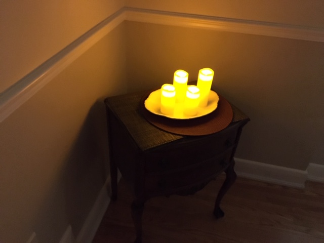 After a while we called the hydro help line again and were told the restoration time would now be 9:00 pm. We thawed some pork chops to cook on the BBQ, and made a salad. There was still enough warmth and light to eat outside. After dinner we piled the dishes in the sink, hoping the dishwasher could be used before we ran out of plates. We checked our watches – only 7:00 pm! It was getting darker now and hard to read outside. Would this day never end? We went inside and found candles.