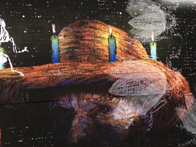 Van Gogh himself appears often, one time looking defeated, another time in a hat adorned with candles which he wore when painting late into the night, and again with a bandaged head where an ear should be. His erratic signature, written in red, foretells his future: death by his own hand at age 37; a huge loss to the art world at such a young age.