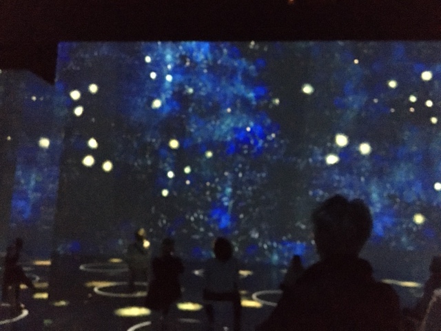 Van Gogh’s best works are represented in this show. (Vases With) Fifteen Sunflowers, perhaps best loved for their glorious yellow hues, dance across the walls. A single candle flame expands into a table with characters seated around it: The Potato Eaters. A farmer’s field seems to grow a bed, and The Bedroom appears. Stars on a background of brilliant blue float on walls and floors and become The Starry Night. Transitions from one work to another are fascinating. A hand seems to pull back one scene to reveal another. Wheat fields morph into irises which in turn become almond blossoms – a whole roomful of white almond blossoms on the most glorious blue background.
