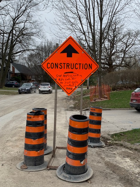 Recently notices began appearing in our mailbox and on the hydro poles, warning of the new project. Then little blue, yellow and orange flags were planted on our lawn. Next, construction equipment was piled on the sides of the road: orange cones, rubber rings, metal plates, signage – all very picturesque. We held our breath in anticipation.