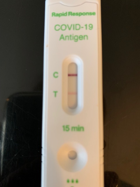 When I got home and prepared to show off my new hair “look,” Peter was sitting in his chair with his new “forlorn” look and a thermometer in his mouth. Oh No! I got out the unused rapid antigen tests and began to read the instructions. It took a little while to assemble all the bits and pieces. Then came the nose swabbing and sneezing. Finally the results – positive!
