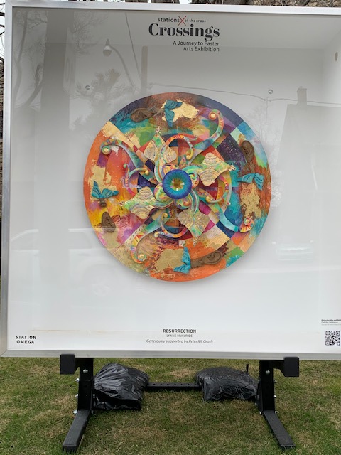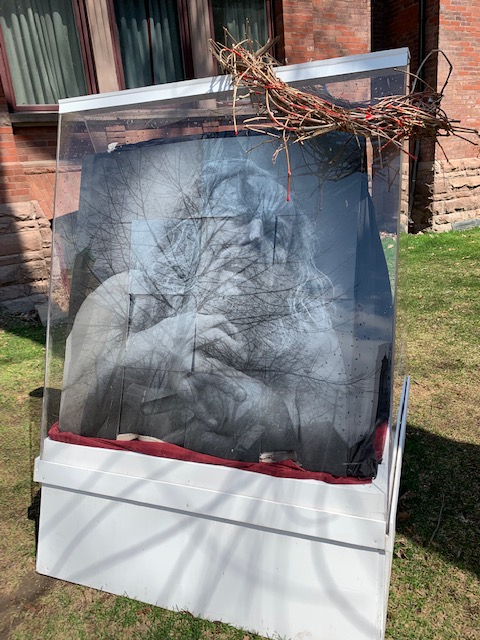 Each station/exhibit is a piece created by a local artist. Some are paintings, some are bronze sculptures and some mixed media. The one of Christ’s final hours on the cross shows incredible suffering, and a crown of thorns dropping blood hangs nearby. The last piece, “Resurrection,” is a joyful image done in pottery.