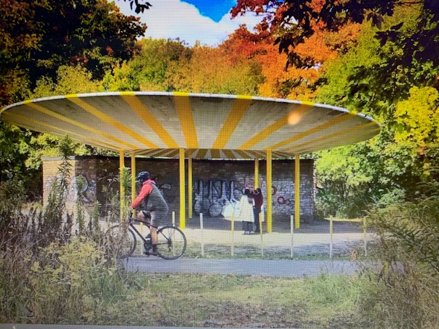 One public washroom Peter and I pass by quite regularly on our walks to Lake Ontario is called the Oculus. It was built in 1959 after Hurricane Hazel tore through the Humber Valley, destroying everything in its path. The Oculus, built as a “comfort station,” fell into disrepair and we found it deserted when we moved here from the country. But recent attempts have been made to restore it. The latest renovation has begun with bright yellow vinyl stripes attached. This new washroom is aptly titled ” Brighter Days Ahead.” We could all use some brighter days – and more public washrooms would help! A place to rest in comfort without paying would be welcomed by all.