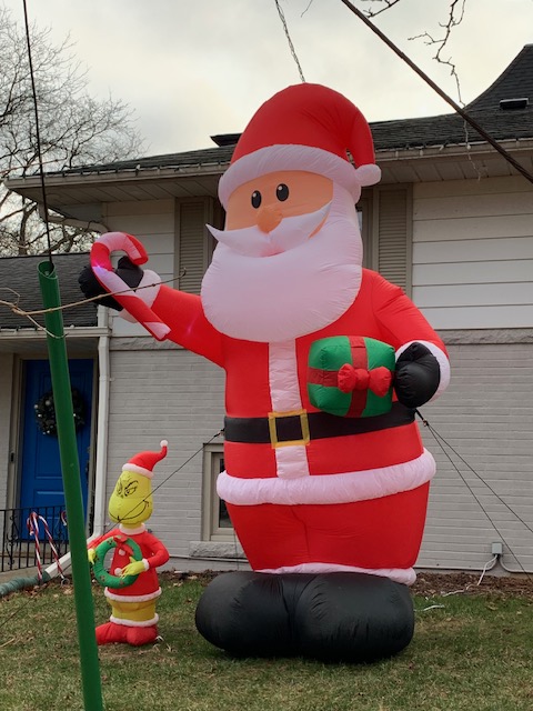 A popular neighbourhood tradition – rows of blow-up Santas. We have a few in our area – a Santa with a green parcel in one hand and a candy cane in the other. Walmart must have had a sale. Apparently one street in Toronto, Inglewood Drive, has over 50 of them. Pretty amazing until the power goes off. Then you have a whole lot of “dead” Santas lying on the boulevard. Not a good Christmas look.