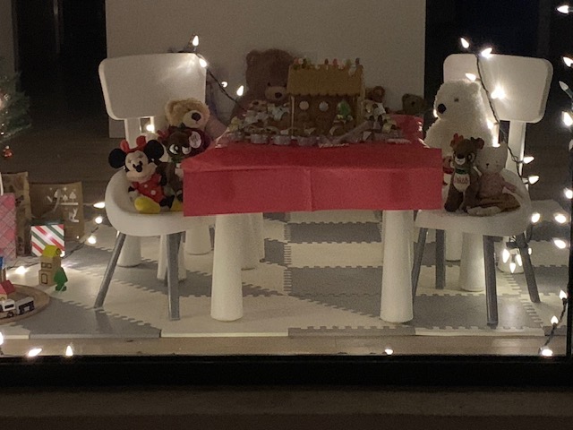 Another family effort, the children’s stuffies gathered around a table waiting for a chance to eat the gingerbread house: