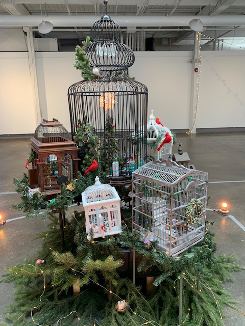 My favourite tree shape was created from vintage bird cages surrounded by evergreen boughs with red cardinals peeking into the scene. The inside of each cage depicts part of the Festival Narrative: holiday preparations in miniature: baking, wrapping gifts, decorating the house, and celebrating with friends.