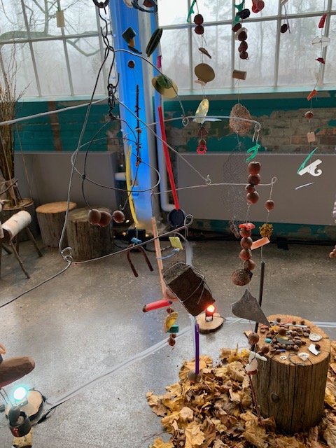 There were several tress devoted to appreciation of nature: a wildlife tree with photos of local animals set on a snow-covered tree trunk, other trunks wrapped in culturally significant threads, ropes and twine, and a hedge titled False Cedars, made of 10,000 paper bundles, showing the disparity between the healing nature of cedar and the world of false materials. The Debris Tree, decorated with bits of garbage was a sobering addition to the display.