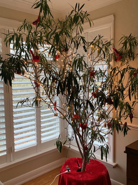 After the tour was over, I headed back home to take another look at our own tree. This year, for the very practical reasons of saving time and space, Peter and a visiting son hauled our oleander bush in from outside, and we decorated it. Tiny white lights, sparkling silver balls and red cardinals all create a festive look. And the oleander seems very happy in its new role. I think I’ll call it: