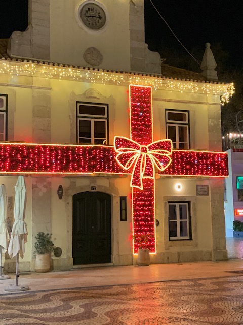 During the following days we left our villa and explored the area. We walked to the beach on the first evening and were surprised to find lights decorating every building and the Ferris Wheel. We ordered our traditional Portuguese Christmas Eve dinner of cod, accompanied by beef, rice and grilled vegetables, and a brave son took the local train a couple of stops to pick it up, all packaged in boxes tied with ribbons and Christmas tags. He made this trip even though he hates cod. It was a noble Christmas sacrifice.